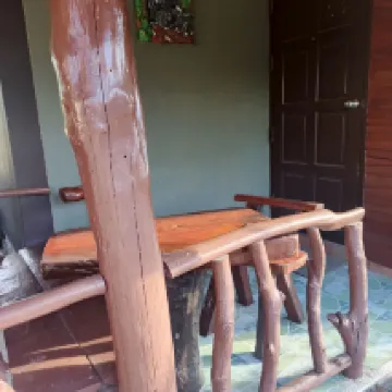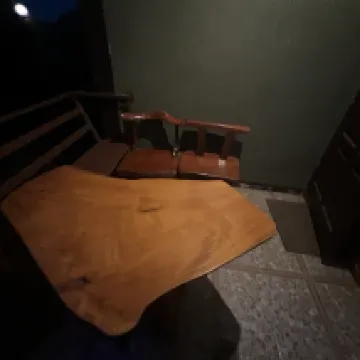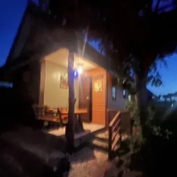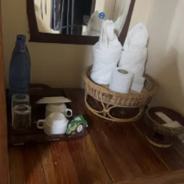 It is a single-family cabin with a table at the door, a large bottle of water and a kettle, as well as coffee and breakfast. Each person has an omelette, coffee and bread.