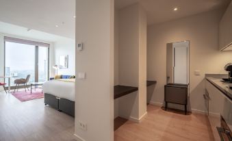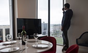 如果是火車站步行至酒店需10分鐘,但酒店對出有“輕軌電車”。 房間很大,大廳加落地玻璃,開放式廚房,洗衣機位於房間中不用走嚟走去收衫。