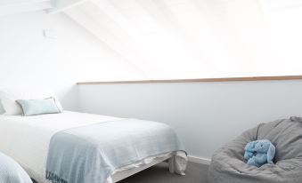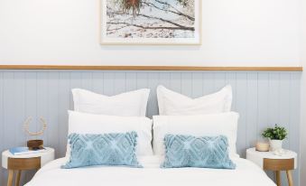 A coastal styled queen bed studio with mezzanine level for the kids and a BBQ on your private deck to enjoy after those long beach days soaking up the sunshine. Ocean Alley is located directly across the road from the ocean front where you will find one of Anna Bay best kept secrets Morna Rockpool's the perfect spot for a dip on high tide.