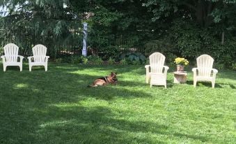 SUN PORCH: Weber gas grill, 2 Adirondack chairs/ ottoman in sun and 4 chairs in large completely fenced in shaded backyard.