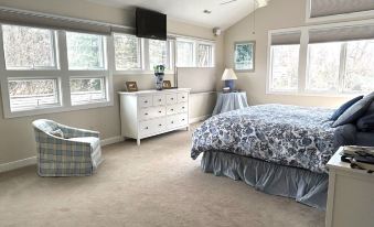 BEDROOM 4: Master Bedroom-upstairs: Surrounded by windows, King Bed with ensuite bathroom, tub/shower, separate commode room. Vanity and mirror area with chair. Guest towels, extra sheets and blankets-wrapped in dust proof bags.