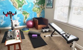 BEDROOM 1: GYM: Keiser stationary bike, full set of dumbbell weights, bands, yoga equip. Brookstone foot massager and TV. Sofa (very comfortable if sleeping needed for 7th person, sheets provided) and chair.