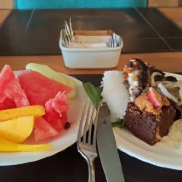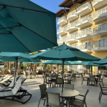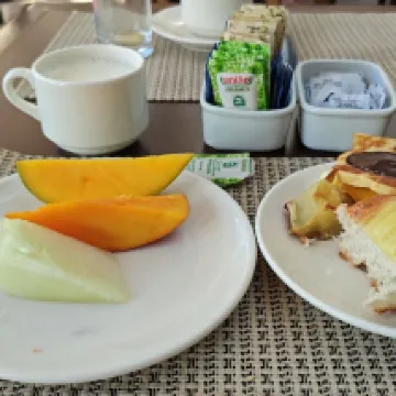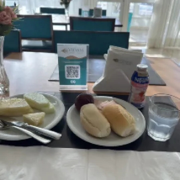 Bom atendimento e hotel agradável com duas opções de piscina com temperatura agradável. O que eu melhoraria: opção de sobremesa sem açúcar, mais opções sem ingrediente de origem animal e alimentos sem glúten.