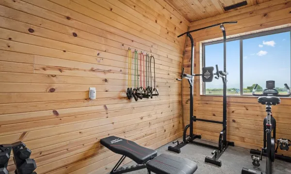 ★ The home gym / workout room is located on the 2nd floor of the barn and includes a stationary bike, chin up / dip station, dumbbell set up to 25 lbs, workout bench, and workout bands