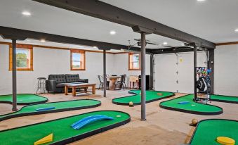 ★ The mini golf course has 9 holes and is located on the first floor of the barn, next to the lounge and arcade area. The arcade includes a SkeeBall machine, Ms Pac Man machine, NFL Blitz machine, PONG 2 seater machine, Marvel Themed Pinball machine, and a Wisconsin Badger 2 player Pop a Shot