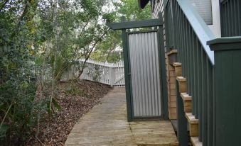 This house provides extra privacy as each bedroom has it’s own bathroom and smart TV. There are two bedrooms in the main house. The master bedroom has a king bed. The other bedroom in the main house has 3 twin beds (2 twins and a trundle). There is also a detached tree-house style guest cottage over the garage, which provides extra privacy with a queen-sized bed, smart TV and ensuite full bathroom. The crofter being detached from the house gives the guests added privacy and quiet.