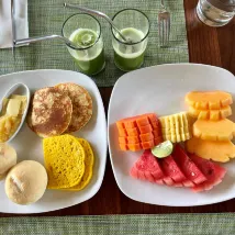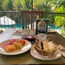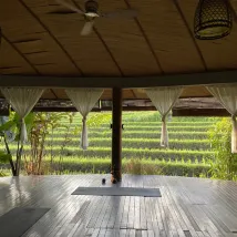 A little oasis tucked away - Breakfast was delicious and healthy and was definitely the best part of my stay! The smoothie bowls and juices and fruits were so fresh. Eggs Benedict on hash brown was amazing. The restaurant was beautiful and if you’re lucky one of their in-house dogs will come up to you asking for food (and pets) . Service was great and counter staff know you by name. The place never felt overcrowded . They have two yoga spaces - Dharma Shala (a small yoga space next to padi fields) and Shala Bhakti (yoga space next to the restaurant usually used by YTT ). Dharma Shala was a bit run down - flooring was uneven and there was always lizard poop or bugs all over the floor. Mats was not that clean or well maintained too. I much preferred yoga and enjoyed the space at Shala Bhakti as the floor was clean and props were well maintained. We attended classes by Bez and Ari - they were patient and kind to beginners, and guided us gently in our practice. Rooms were spacious but with outdoor toilets you would have a bit of a bug situation, but the resort staff will try to clean it as much as they can. If you prefer indoor toilets you might want to book the deluxe room instead. Shopping can be done at pepito grocery store a short gojek drive away. This place is perfect for a get away as it’s quiet and you’re surrounded by nature.