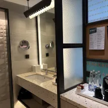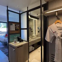 Now for the downsides: The bathroom doesn't have a door, which is a bit inconvenient. I booked a poolside room, but it wasn't direct pool access, which was a bit misleading (refer to picture 7). The pool is quite small, just as it appears in the photo (picture 1). Also, one day, the head of my water flosser, which I had left on the mini-bar counter, somehow ended up on the bathroom floor. I'm not sure if it's because I forgot to leave a tip.