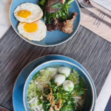 Breakfast was fantastic! The noodle soup and congee were particularly good, and the service staff were prompt in clearing plates. There was also a wide variety of fruits, so much so that we couldn't possibly try them all.