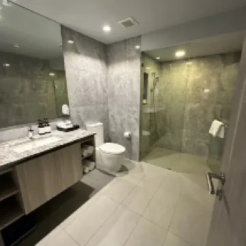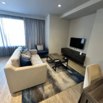 The cafeteria downstairs has amazing food, and the breakfast spread is fantastic with a great variety of delicious options. All the staff members are incredibly friendly, and the swimming pool environment is quite nice. If you're traveling as a family, I highly recommend this apartment. It features two master bedrooms, a living room, three bathrooms, and a laundry room. We slept very comfortably. Plus, there's a 7-Eleven right downstairs and a large shopping mall, and it's only a 5-minute walk to the metro station!