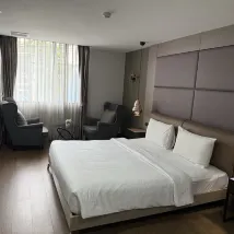 The room was spacious, clean, and modern, with a stylish wood floor and comfortable bed. I loved the cozy sitting area by the window – perfect for unwinding after a long day.