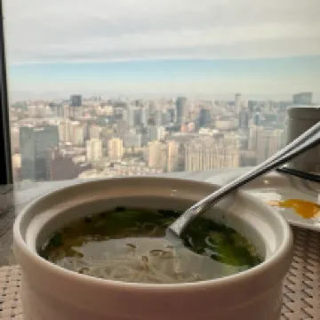 The hotel is located in a convenient area. There is a metro station nearby. The hotel itself starts from the 40th floor. Breakfasts are also available there. The breakfasts are good and include Chinese and European cuisine. There is not a lot of choice, but there is something to choose from. The room has a guest room, a dining area, a separate bedroom, and a bathroom. The rooms are not brand new, but they are clean. If you stay for a few days or more, there are all the necessary amenities, such as a washing machine, a microwave, and a refrigerator. The kitchen is equipped with everything necessary, including dishes.