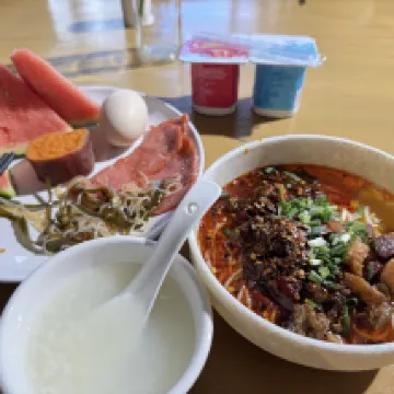 The hotel decoration is slightly old, but the rooms are fully equipped and clean. The bathroom wash area is reasonably divided and easy to use, and there is plenty of hot water. The spicy chicken rice noodles for breakfast are delicious, and self-service laundry is available, which is great!