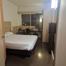 Room: Clean, for its size and price, enough space to put stuff, has safe, but no refrigerator nor coffee machine. its basic. Bed was double but actually like US king size, it was too hard for me. Temp control only has AC so even with AC turned off, the room (1501) was bit cold. Bathroom has hair dryer, simple yet enough space, has shower unit with hot shower (only rain fall option, no hand held). There is couple USB-A & power outlet right to the bed, our was not working. Also a power outlet by the desk area.