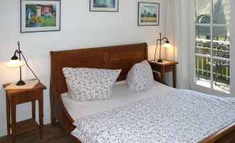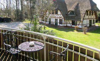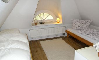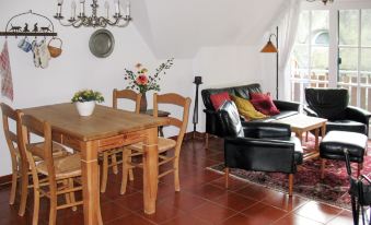 Apartment block "Rosengang". 12 apartments in the residence. 300 m from the centre of Born, on the outskirts, 8 km from the centre of Prerow, 55 km from the centre of Rostock, 10 m from the edge of the forest, 5 km from the sea, in a cul-de-sac. For shared use: well-kept garden (not fenced) with lawn and trees. Supermarket 300 m, bus stop "Born a. Darss (Mitte)" 850 m, sandy beach 5 km. Marina 1.5 km. "Rosengang-ALK", 3-room apartment 70 m2 on 2 levels. Tasteful furnishings: upper floor: living/dining room with open-hearth fireplace, satellite TV and CD-player. Exit to the balcony. 1 double bedroom. Kitchenette (oven, dishwasher, 4 ceramic glass hob hotplates, toaster, electric coffee machine). Shower/WC. Gas heating. Top floor: 1 room with sloping ceilings with 2 beds. Balcony. Balcony furniture. Facilities: baby cot (extra). Parking (1 car). Please note: non-smokers only. Maximum 1 pet/ dog allowed. Smoke alarm.