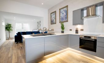 The living area consists of a large open plan space with bespoke kitchen, 6-seater dining table, and lounge area. Relax in the lounge area complete with large sofas and 50-inch smart tv with over 42 free view channels & Netflix. Enjoy the freedom of a fully equipped kitchen, complete with hob, fridge, freezer, microwave, and toaster, along with a full range of utensils, crockery, and cutlery. Superfast WIFI comes as standard.
