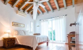 This contemporary villa with extensive windows and glass doors is built around a pool and lush, tropical garden. One great room with a soaring ceiling includes a living room, dining room, kitchen, and entryway where family and friends can comfortably gather. A spacious covered terrace provides additional seating and lounging areas. There is also an outdoor bathroom and shower in addition to the 3 bathrooms indoors. This property is completely private and very romantic.