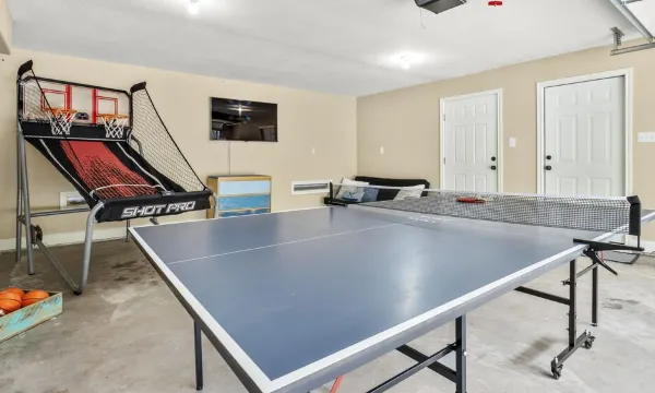 The game room features ping pong, a basketball arcade, giant jenga, corn hole, sofa, TV, and HDMI cable. Lounge on our covered and uncovered deck areas while the kids jump in the lake for a swim. Beach towels, life jackets, and lake floats are provided.