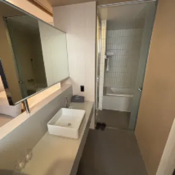 The hotel was wonderful. The room was big and the bathroom has a tub and a shower. The rooftop pool had a view of the ocean through the city. It was a bit confusing to find breakfast from one building to the next but certainly manageable. The hotel has a convenience store in the lobby that is 24 hours.