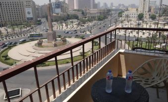 Because of the location, the price, and previous reviews, we hadn't expected much of the hotel, but were delighted when we arrived. We were greeted downstairs, and taken up in the lift to the reception on the fifth floor (called the ground floor by the hotel), our bags carried for us. The reception staff were well presented, professional, and very warm, friendly, and helpful. And we loved our room which was clean, tidy, well presented, freshly decorated, and with a great view of the roundabout, which was a source of much entertainment for the family. We enjoyed sitting out on the balcony watching the traffic! The hotel entrance is a narrow gated alley to the right of KFC. If a taxi driver doesn't know the hotel, tell him "KFC Tahrir Square". When dropped off you'll have to walk to the right to get around the metal fence separating the road from the pavement. The roof terrace is functional rather than attractive. The male staff on reception at night were OK, but were often slow and reluctant to stop smoking and get out of their chairs. If requesting extra soap or toilet paper it is best to stay in reception until the items are produced, otherwise you might either wait a long time, or simply not get it. The bathroom was freshly refurbished, but the design did not include a soap holder in the shower, or a towel rail (we used the door handle). To be fair, these are small quibbles, for the price and location (Cairo Museum is in the same street, Cairo Tower is a short walk away across the Nile, and the Metro is across the street), this is a decent hotel.