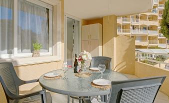 Apartment block "Apolo VII", 7 storeys. In the centre of Calpe, in a central position, 400 m from the sea. For shared use: garden, 2 swimming pools (seasonal availability: 01.May. - 30.Sep. pool opening hours: 10:00-21:00). Children's pool, outdoor shower, boccia, terrace. In the house: WiFi, sauna (extra). Fitness room (extra). Hot tub (extra). Table tennis (extra). Lift. Supermarket, shopping centre 400 m, restaurant, bar, café 10 m, bus stop, sandy beach 400 m. Nearby attractions: Aqualandia, Mundomar, Terra Mítica, Terra Natura, Benidorm Palace (Benidorm). Minigolf for children, Sauna, Squash and Ping Pong in the building (all EXTRA). "Apolo VII", 2-room apartment 48 m2 on 1st floor. Object suitable for 2 adults + 2 children. Bright, beautiful and cosy furnishings: living/dining room with 1 double sofabed, satellite TV and digital TV. Exit to the terrace. 1 room with 1 french bed (150 cm, length 200 cm), air conditioning and forced-air heating. Open kitchen (oven, dishwasher, 3 ceramic glass hob hotplates, toaster, kettle, microwave, electric coffee machine). Bath/bidet/WC. Electric heating. Heating available only from 01.11. to 30.04. Large terrace 15 m2. Balcony furniture. Facilities: washing machine, iron, hair dryer. Internet (WiFi, free). Please note: non-smokers only. Maximum 1 pet/ dog allowed. AT-460728-A // Reg. Nr.: ESFCTU00000302900042438500000000000000000AT-460728-A7