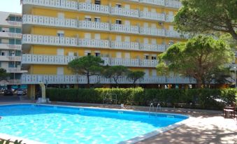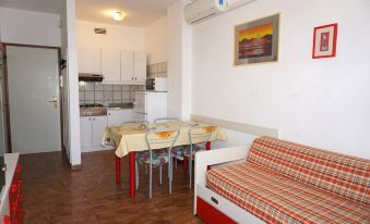 One-bedroom flat for up to four guests, located on the 5th floor of a seaside building with an elevator and a shared outdoor swimming pool. The property features a balcony with side sea view, a bedroom with a double bed, a kitchenette and eating area, a living room with a trundle bed, and a full bathroom with shower (curtains) and a washing machine. It comes with one covered parking space. *No pets allowed. A/C is available at an additional cost (check below). °Swimming pools are open seasonally (mid June/early September): exact dates may vary due to weather or maintenance