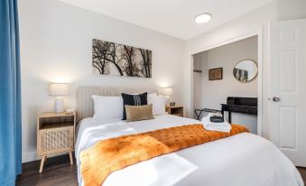 Whether staying for a weekend away or an extended period of time, everyone will be comfortable in the spacious bedrooms with a mix of clothing storage options. Brand new beds, one king and two queen, with plush linens and blackout curtains will allow anyone who desires to sleep in the privilege. The primary bedroom offers an ensuite bathroom with shower-tub combo and a walk-in closet, and the guest bath with similar features for the two guestrooms. Each are equipped with large-fluffy towels and the perfect amount of amenities to enjoy during your stay. We hope you'll both love the custom handcrafted bar soaps from Rough Cut Soap Co, which you can also visit while exploring the downtown scene.