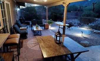 Enjoy a front-row seat to the breathtaking Santa Catalina Mountains from the covered patio. The backyard is enclosed with a wrought iron fence. There is comfortable outdoor seating for relaxing and a pub table for snacking. A small propane grill is available for your use as well. Garage parking is available and you can park on the driveway or street as well.
