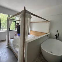 The owner Ada is above and beyond. I needed to ship a package so she walked me to the post office late at night to make sure I knew where to go. John was beyond helpful with travel / destination recs. Location is amazing; you're right next to An Shun bridge, 15 min walk to Tai Koo li, and close to LKF for night life as well. You're right on the water, so that's good. You're right next to a street, but there's not noise pollution at all. Blackout blinds work really well. Free water, beer waiting for you on your room. I got the big room; good desk for working.
