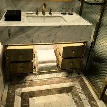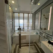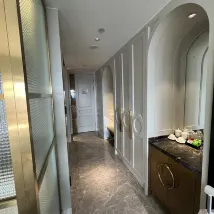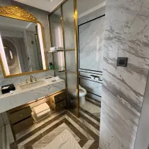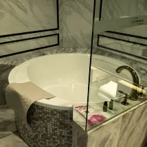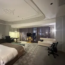Upon entering the room, I was immediately drawn to the massive 2x2 meter super king-size bed. The mattress had the perfect balance of softness and firmness; lying on it felt like being gently cradled by clouds. The comfort level was off the charts, ensuring even a light sleeper like me had a perfect night's rest. The room, spanning a generous 50 square meters, felt incredibly spacious with a well-thought-out layout, never feeling cramped. To the left upon entering, there was a wardrobe, a shoe-changing stool, and a mini-bar. A thoughtful touch was the small refrigerator, perfect for keeping drinks chilled. To the right was a vanity area with a dry/wet separation design, and the standalone bathtub was very large. After a tiring day of exploring, a hot soak in the tub completely melted away all my fatigue. Although the bathroom wasn't huge, it was fully equipped. The smart toilet was very comfortable to use, and the large mirror even had a heating function, preventing it from fogging up during showers – every detail was perfectly considered.