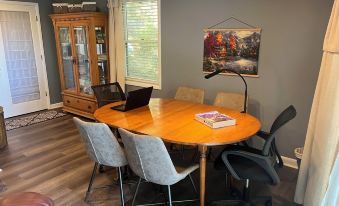 The main level has one step from the driveway into the house for easy access for limited mobility guests. Main level features 2 bedrooms (1 king and 1 queen) and a full bath with walk-in shower. Perfect for guests of all ages and physical abilities. The main level also has a fully-stocked kitchen, dining area for 6 and den with wood-burning fireplace and gas starter! (Firewood available seasonally.)