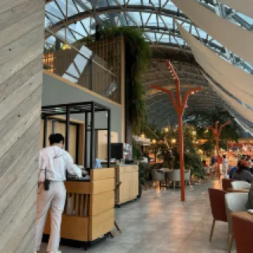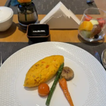 The hotel's location is excellent, offering expansive views. The service is just right, attentive without being intrusive. The lobby is visually striking, and the rooms are comfortable and cozy. Breakfast is fantastic, especially the high-quality fruit.