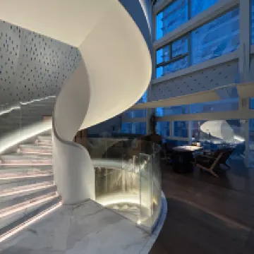 The room itself is incredibly spacious and impeccably clean, featuring floor-to-ceiling windows with city and river views. It's equipped with numerous smart devices such as a Nespresso machine, a high-end HD projector, and a smart toilet. The bathroom even has a wet and dry area separation.