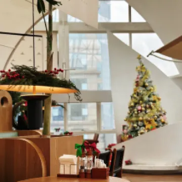 For only $66 a night, the stay includes afternoon tea and breakfast for two. The restaurant is already decorated for Christmas, creating a cozy, festive atmosphere. The breakfast is a lavish spread of Chinese and Western dishes, including various breads and salads, Western pastries, bacon, Chongqing noodles, and freshly brewed coffee.