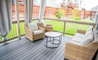 Fully fenced in backyard with a patio deck that has a sitting area and a grill.