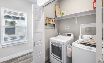 Offers a fabulous-equipped kitchen with granite countertops and stainless steel appliances. The dining table can seat 4 and the bar can seat 4. Morning coffee will be a Keurig with pods provided. Across the kitchen wall is a great big black chalk board for everyone to enjoy and get creative with ART and games during your stay!