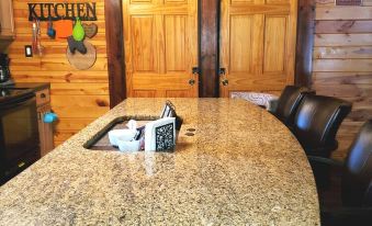 The Iron Willow was originally a lake cabin! It was moved to it's current location about 25 years ago (sorry, no lake!). The fully stocked kitchen includes a full-size refrigerator with water dispenser and ice, electric stove, microwave, keurig coffee maker and more. The main level has a vaulted ceiling, open floor plan, kitchen island with seating and window air-conditioning units. The master bedroom with TV, a bunk-bed room and a full bath are also on the main level. There is an Echo Dot with Amazon Alexa in the living room. Ask Alexa (via Echo Dot) to turn on the TV, play some music, turn off the lights, lock the doors and more!