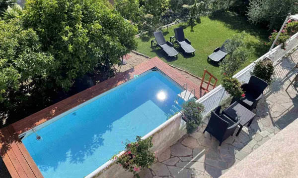 Beautiful 2-family house "Villa Paradiso", 2 storeys, surrounded by trees. 2 apartments in the property. In the district of San Paolo 2 km from the centre of Dolcedo, 10 km from the centre of Imperia, 35 km from the centre of San Remo, in a sunny, elevated position on a slope, in the residential district, 9 km from the sea. For shared use: beautiful garden to relax, swimming pool (above ground) angular fenced (6 x 4 m, depth 120 cm, seasonal availability: 15.Apr. - 15.Oct.). 150 m long narrow motor access. Shop 2 km, supermarket 10 km, restaurant 2 km, bar 2 km, bakery 2 km, café 2 km, bus stop 200 m, sandy beach 14 km pebble beach 10 km, outdoor swimming pool 15 km, indoor swimming pool 15 km, bathing lake "Lecchiore" 4 km. Riding stable 6 km, cycle lane 9 km. "Villa Paradiso (DOL192)", 5-room house 135 m2 on 2 levels. Partly renovated in 2015: living/sleeping room with 1 double sofabed, dining table, satellite TV and radio. Exit to the garden. 1 room with 1 double bed. Open kitchen (oven, dishwasher, 4 gas rings, toaster, freezer, electric coffee machine). Shower/WC. Upper floor: living/sleeping room with winter garden with 1 double sofabed (160 cm), satellite TV, radio and CD-player. Exit to the balcony. 2 rooms, each room with 2 beds (80 cm). Kitchen (oven, dishwasher, 4 gas rings, toaster, kettle, microwave, freezer, electric coffee machine) with dining table. Shower/WC. Gas heating. Balcony, patio, garden. Terrace furniture, balcony furniture, barbecue, deck chairs (4). Panoramic view. Facilities: washing machine, baby cot. Internet (WiFi, free). Parking (2 cars) at the house. Please note: private entrance. No internal connecting door between the floors. The pool mentioned in the description is for private use. IT008030C28SJN2FBB