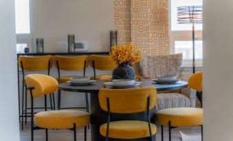 🍽 Dining Area: A round dining table with cozy mustard-gold chairs makes meals feel special — ideal for group dinners, laptop work sessions, or evening wine with a view.