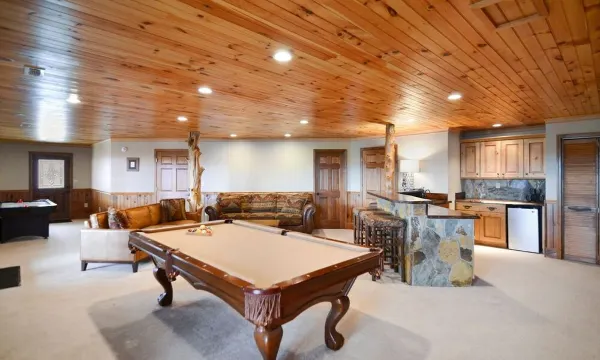Upon entering, you are immediately greeted by the breathtaking mountain views through floor to ceiling windows in the vaulted great room, with direct access to the expansive 1st level deck showcasing said views. To the right is the master suite with vaulted ceiling and direct access to the large deck. Also to the right is a large enclosed laundry room with washer, dryer, iron and ironing board. To the left is the kitchen and beautiful hearth area, with vaulted ceiling and direct access to the large screened porch facing the view. The massive loft area with with two twin beds and a trundle are just above the kitchen and hearth. Down the hall you will find a full bath with tub/shower combo and two queen bedrooms on each side. Downstairs leads to another expansive Master Suite with a king bed and a set of twin bunk beds with it's own bathroom, with direct access to the lower deck with hot tub and views. The game room and wet bar are also located downstairs, with direct access to the lower deck and hot tub. The back includes a flat play area with kids playhouse and a custom built fort, with climbing wall and slide! And no cabin is complete without an outdoor firepit, perfect for those hot dogs and marshmallows, or just good conversation.