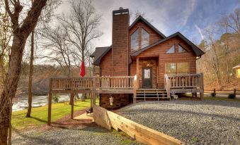 112' of RIVER FRONTAGE on the Toccoa River! Enjoy the serene sounds of the river from the outdoor fireplace, private master balcony, or right by the river's edge firepit. This 3 Bed, 3 Bath Rustic Prow Front Cabin Features vaulted ceilings, floor to ceiling rock fireplace, spacious kitchen w/high end stainless appliances and granite counter tops throughout the cabin! Wrap around porch allows for dining and taking in the views from all 3 levels of the house. Master Suites have jetted tub, tile shower & double vanities. The Upstairs Master has a TV and Private Balcony Overlooking the Beautiful Toccoa River. If you must work, the Loft Office has a desk, chair, monitor and supplies you need! Hi-speed internet will keep everyone connected. Terrace Level has another fireplace with gas logs, flat screen TV and Wet bar.