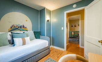 A sleeper couch folds out to a twin size bed. A mattress topper and linens and pillow can be found in the closet in the blue room.