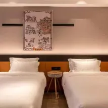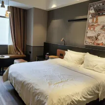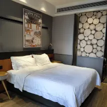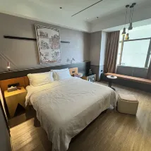 The hotel is located in a bustling night market area with plenty of food options, but it's very noisy. They offer complimentary mung bean soup in the evenings, which is a nice touch. The front desk proactively upgraded our room, but it reeked of smoke. They were cooperative when we requested a room change, but the replacement room was truly terrible. The Bluetooth speaker didn't work, all the outlets on one wall for the projector were dead, so the mini-fridge was also unusable.