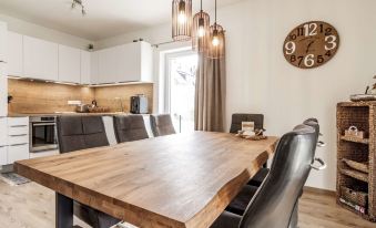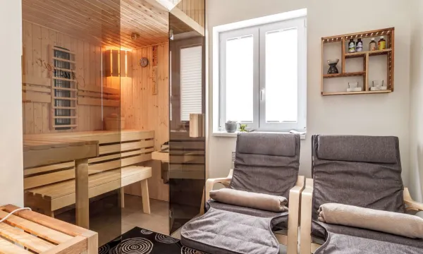 Child friendly, modern resort "Lakeside Village". 45 houses in the resort. 10 apartments in the residence. Outside the resort, in a quiet, sunny position, on the lake. For shared use: property. Private beach, beach volleyball, barbecue, fireplace, children's playground. In the complex: reception, bar, bistro, kiosk, bicycle rental. Available: boat (extra). Bread roll service and breakfast on request. In Winter: please take snow chains. Parking at the house. E-charging station. Bus stop "Frymburk Vřesná, rozcestí" 3.5 km, bathing lake "Lipno". Riding stable 500 m, ice rink 11 km. Nearby attractions: Aquaworld, Marina Lipno, Bobová dráha, Lanový park, Bikepark (Lipno) 15 km, Český Krumlov (UNESCO) 35 km. Well-known ski regions can easily be reached: Frymburk 5 km, Kramolin 15 km, Sternstein 25 km, Hochficht, Sterngartl 40 km. Hiking paths: Stezka korunami stromů (Lipno) 15 km. Please note: baby equipment on request (extra). Fishing [permit required], private mooring. All houses/apartments are individually designed/furnished. "Lakeside Village 33 (+ sauna)", 5-room house 100 m2 on 2 levels. Comfortable and cosy furnishings: living room with Scandinavian wood stove. Kitchenette (4 hot plates, oven, dishwasher, kettle, microwave, electric coffee machine) with dining table, satellite TV. Shower/WC, Sauna. Floor heating. Upper floor: 3 rooms, each room with 1 double bed. 1 room with 2 beds. Shower/WC. Balcony, terrace. Terrace furniture. Partial view of the lake. Facilities: Internet (WiFi, free). Suitable for families.