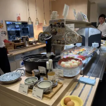 Came to Fukuoka, Japan for a vacation with friends and chose this hotel right next to Hakata JR Station for its convenience for our next day's itinerary. Overall, the room was a bit small, but everything else was pretty good. Downstairs, they have self-service toiletries and cosmetics, as well as a self-service coffee machine. The breakfast the next morning was delicious and extensive, featuring mentaiko (spicy cod roe), natto, onsen tamago (hot spring egg), with unlimited rice and ramen, plus fruits and coffee.