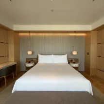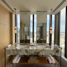 The bathroom is another highlight with a sculpted free‑standing tub, rainfall shower, and dual sinks carved from luxurious Mont Carmelo granite—each detail framed by sweeping cityscape views and natural sunlight pouring in. Throughout the suite, refined touches include natural woods, artful Hakata‑ori textile accents, and ambient lighting—creating a serene atmosphere that pays homage to local crafts