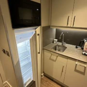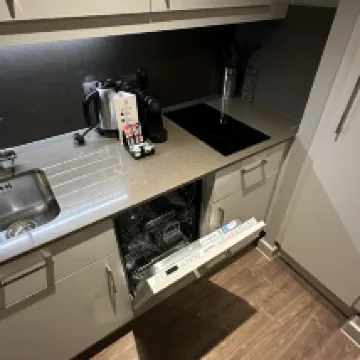 Tesco and Lindl supermarkets are just about 2 to 3 minutes walk away, so you can buy something to cook in the apartment hotel if you wish. In-room Pantry are with microwave, kettle with dining wares, glasses etc. There is a laundry room with washer and dryer (pay separately £3+£3). Actual conditions are still new as per photos. It's also wonderful to walk along the river bank which is 1 block away from the hotel. There are pubs near the hotel but you can't hear the noise with window closed and air conditioning turned on.