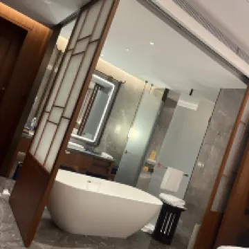 The hotel room was spacious and well-equipped. The bathtub facing the floor-to-ceiling window offered an amazing view. The washroom area had a separate door for privacy, which was a huge plus! The biggest surprise was the 24-hour room service; the sticky rice and wontons were delicious.