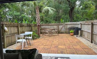 Lovely private outdoor fenced space with covered patio for lounging and relaxing that includes couch, 2 ottoman and picnic table that turns into a bench and charcoal grill.