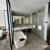 Radisson Blu really stole my heart this trip. They gave us a free upgrade as we’re celebrating a birthday and superb service. The bed was huge and the bathtub and toilets/vanity area was super clean and sparkly. They even have a robot delivery and the helped us order ******* when our apps weren’t working. Will definitely be back again and highly recommend staying in this hotel although it may be a little further.